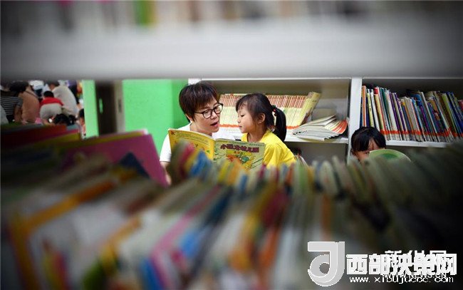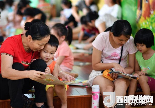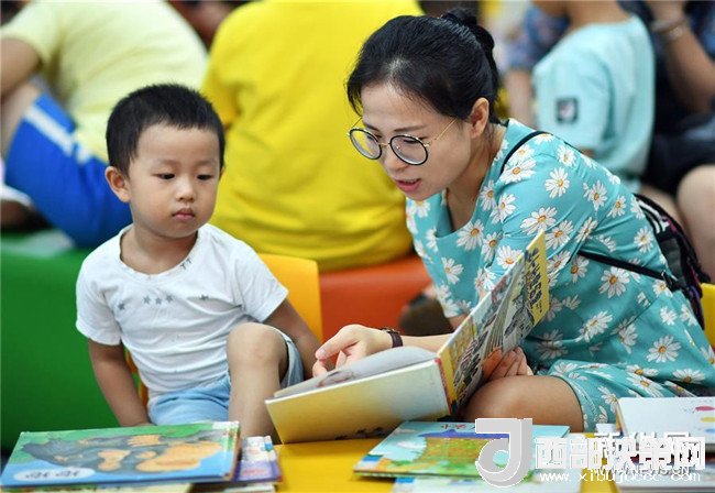 7月15日,家長帶著孩子在海南省圖書館看書。