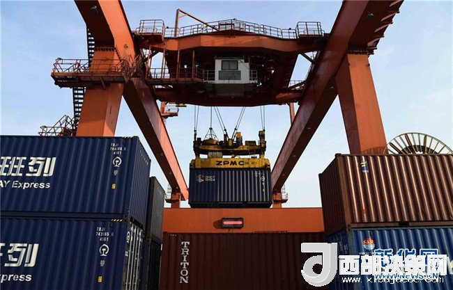 在青島膠州灣國(guó)際物流園,龍門塔吊在往中亞(青島)國(guó)際班列上裝載貨物(5月7日攝)。