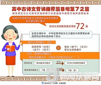 其中,語文課標(biāo)最突出,中華優(yōu)秀傳統(tǒng)文化方面的內(nèi)容貫穿必修、選擇性必修和選修各個(gè)部分。一是內(nèi)容更全,在“課內(nèi)外讀物建議”部分,除保留原有《論語》《孟子》《莊子》外,增加了《老子》《史記》等文化經(jīng)典著作,要求學(xué)生廣泛閱讀各類古詩文,覆蓋先秦到清末各個(gè)時(shí)期。二是分量更多,課程標(biāo)準(zhǔn)明確規(guī)定“課內(nèi)閱讀篇目中,中國古代優(yōu)秀作品應(yīng)占1/2”。三是要求更高,在全面加強(qiáng)的同時(shí),還設(shè)置中華優(yōu)秀傳統(tǒng)文化學(xué)習(xí)專題,進(jìn)行中華傳統(tǒng)文化經(jīng)典作品深入學(xué)習(xí)研討。將原標(biāo)準(zhǔn)“誦讀篇目的建議”改為“古詩文背誦推薦篇目”,推薦篇目數(shù)量也從14篇(首)增加到72篇(首),提高了學(xué)習(xí)要求。