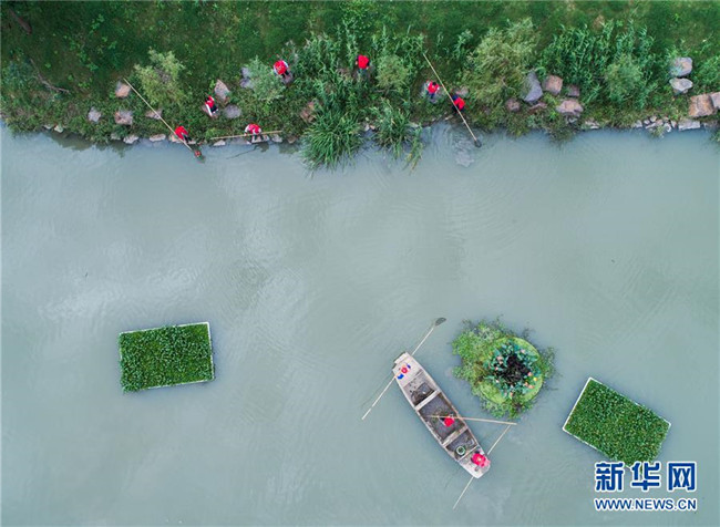在浙江省長(zhǎng)興縣劉家渡河道南太湖段,河長(zhǎng)帶領(lǐng)專職保潔人員進(jìn)行日常鄉(xiāng)村河道護(hù)理(2017年10月13日無(wú)人機(jī)拍攝)。