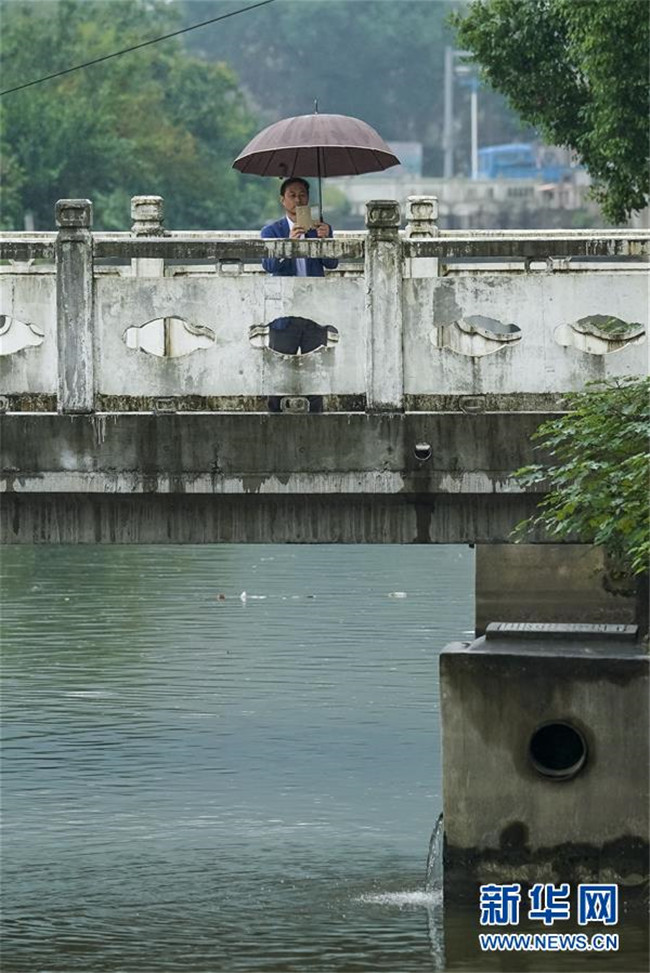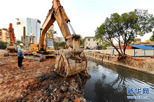 福建省福州市鼓臺(tái)中心區(qū)水系綜合治理點(diǎn)達(dá)道河河長(zhǎng)溫水林在指揮工人進(jìn)行河道新建截污管的回填(2017年10月11日攝)。