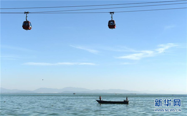 下方是工作人員在滇池上準(zhǔn)備打撈垃圾和雜物,上方是游客乘坐纜車在觀賞滇池景色(2017年11月14日攝)。云南省昆明市滇池流域自2008年以來(lái)實(shí)行河長(zhǎng)制,河道生態(tài)環(huán)境和水質(zhì)得到明顯改善。