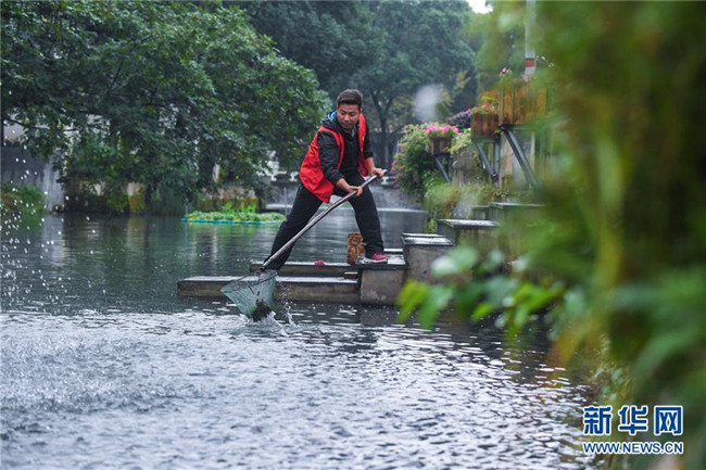 在浙江省長(zhǎng)興縣龍山街道渚山村車渚港河道內(nèi),河長(zhǎng)王佳進(jìn)行日常鄉(xiāng)村河道護(hù)理巡查(2017年10月12日攝)。