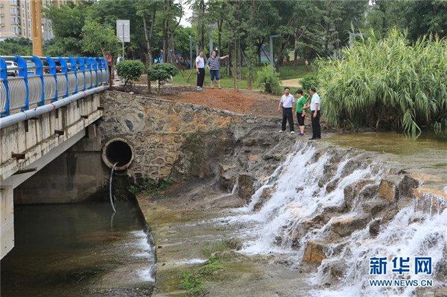貴州省興義市桔山河的市級(jí)河長(zhǎng)葛佳華(右二)與鎮(zhèn)級(jí)、村級(jí)河長(zhǎng)對(duì)桔山河沿線一處排污管道進(jìn)行巡查(2018年7月15日攝)。