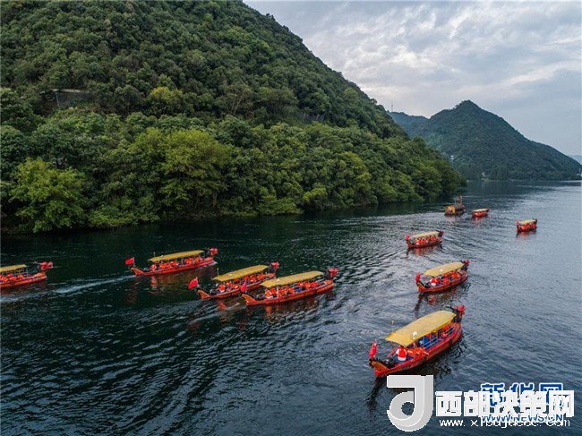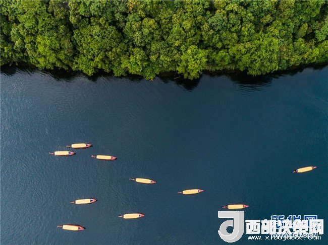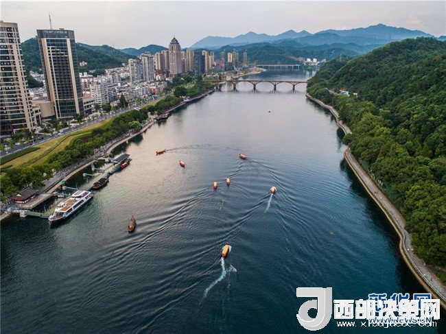 7月23日,游客乘船在新安江浙江建德段江面上游玩(無(wú)人機(jī)拍攝)。