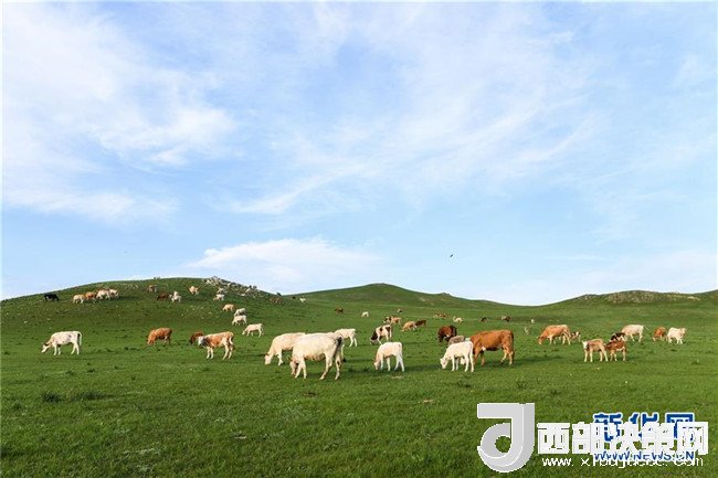 牛群在西烏珠穆沁旗的山地草原上覓食(7月23日攝)。
