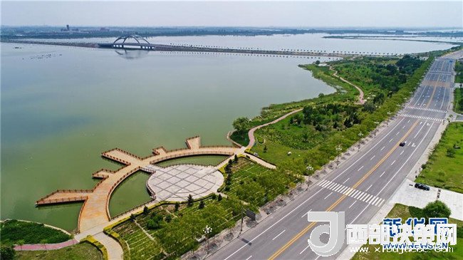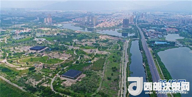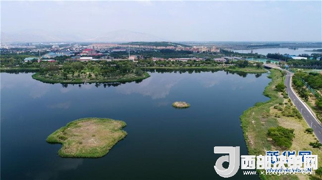 寧夏石嘴山市星海湖及周邊水系貫穿城市(7月31日無人機拍攝)。 新華社記者 王鵬 攝