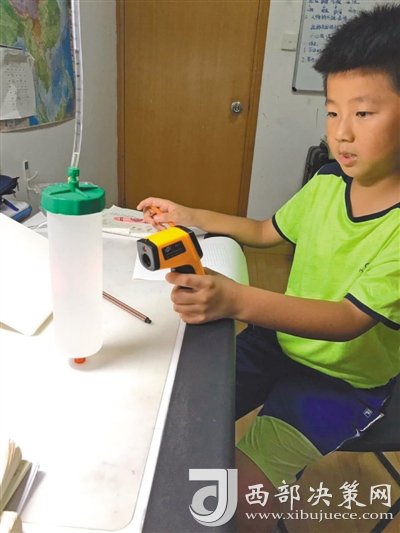 首先設(shè)計一個裝置,下部寬大的容器盛水,上部細(xì)長的管子可以觀察水的體積變化。然后將裝滿水的容器放入冰箱冷凍層,形成冰水混合物,此時水溫接近零攝氏度。最后將容器取出,用手持式測溫儀測量水溫……這一系列步驟,不是實驗室里進行的專業(yè)研究,而是南京師范大學(xué)附屬小學(xué)四年級學(xué)生徐子越和王美澄正在做的暑假作業(yè),他們通過觀察水的體積隨溫度的變化,來解釋冰為什么會浮在水面上。