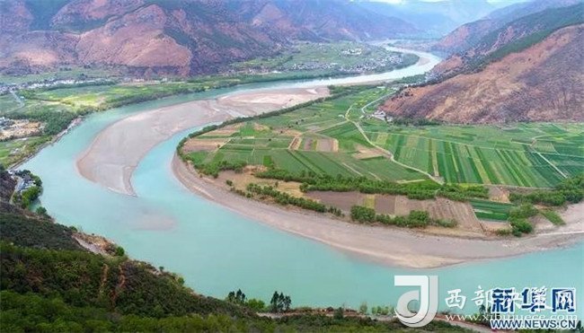 云南省麗江市石鼓鎮(zhèn)綠樹(shù)和農(nóng)田掩映下的“長(zhǎng)江第一灣”(來(lái)源:新華網(wǎng))