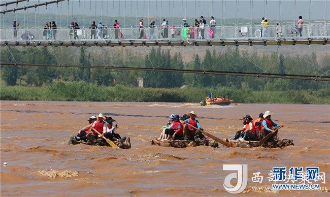 8月22日,游客在中衛(wèi)市沙坡頭旅游景區(qū)乘坐羊皮筏子游覽。沙坡頭旅游景區(qū)因地制宜發(fā)展沙漠旅游,旺季日接待游客量達(dá)兩萬(wàn)人次。新華社記者任鵬飛攝