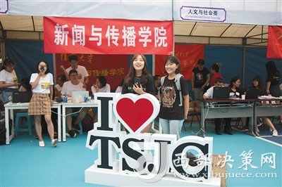 在綜合體育館門口,各院系報(bào)到區(qū)的學(xué)長(zhǎng)學(xué)姐們已早早準(zhǔn)備好,等待“八字班”新生的到來。迎新自然少不了“吉祥物”,有的學(xué)長(zhǎng)還穿起玩偶裝,時(shí)不時(shí)與新生互動(dòng)一番。