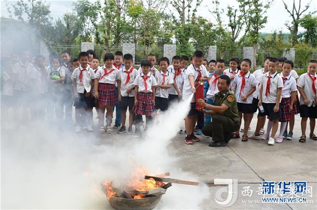 8月27日,余慶縣城關(guān)一小的學(xué)生在消防隊(duì)員的指導(dǎo)下學(xué)習(xí)使用滅火器。
