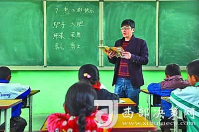 在甘肅省永靖縣小嶺鄉(xiāng)土門村土門小學(xué),校長(zhǎng)鮮虎給一年級(jí)學(xué)生上語文課。新華社記者 范培珅攝