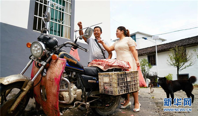 9月4日,陳春英(右)購買豬肉,為學(xué)生們準備午飯。 新華社記者胡晨歡 攝