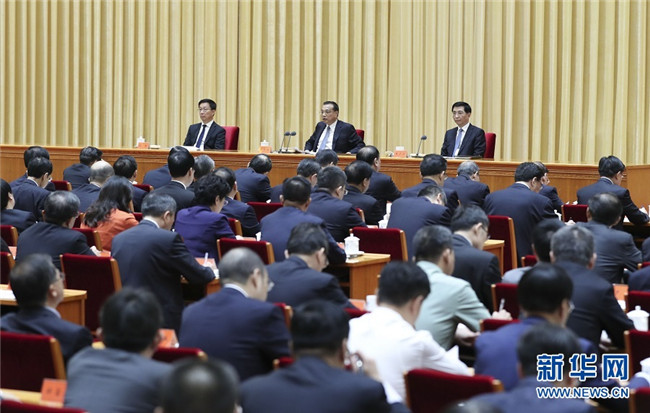 李克強(qiáng)在會(huì)上講話。汪洋、王滬寧、趙樂際、韓正出席會(huì)議。