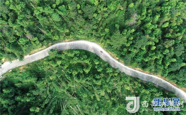 高自仁駕駛助力車行駛在前往梅嶺鎮(zhèn)立新村立新學(xué)校的山路上(9月4日無(wú)人機(jī)拍攝)。新華社記者 彭昭之?dāng)z