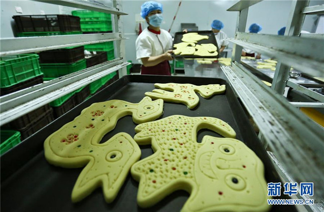 9月18日,在甘肅張掖一家超市的主食加工車間,工作人員在制作“土月餅”。