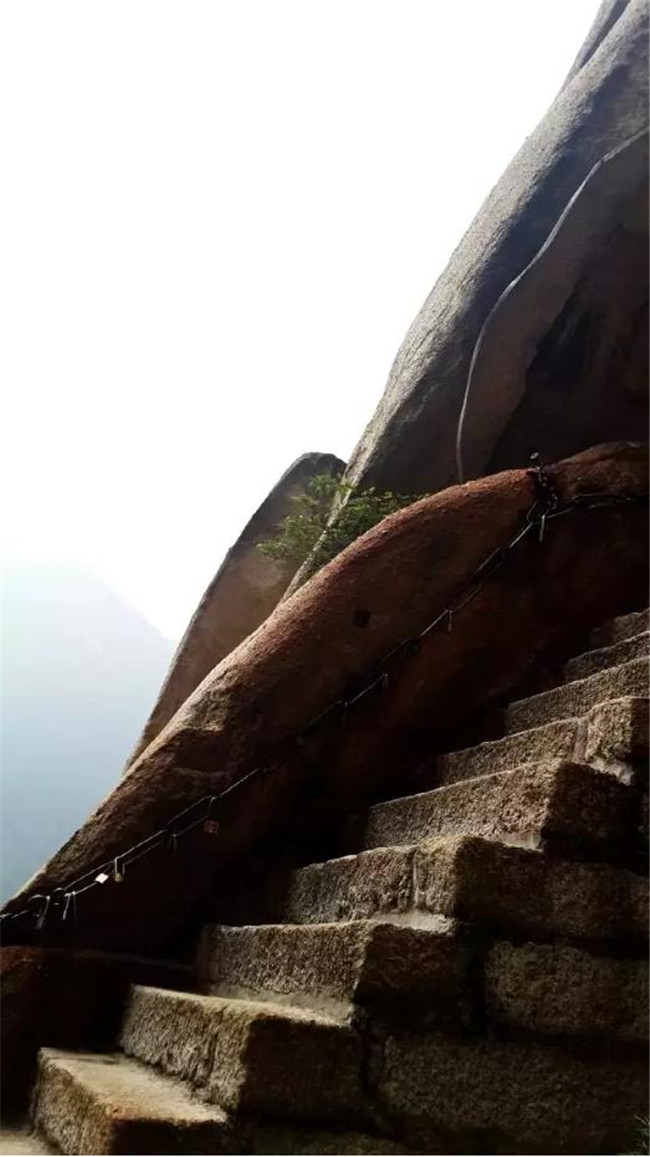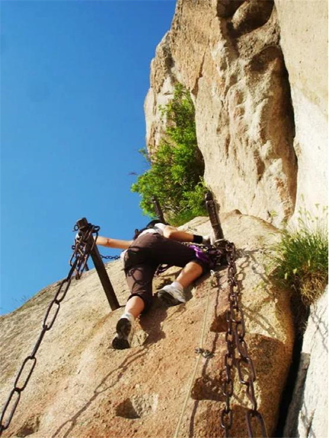 這是一條峭壁上的大裂縫,陷在兩旁的巨石之間,共370余級(jí)臺(tái)階坡度極陡,每級(jí)臺(tái)階的寬度不過(guò)三分之一的腳掌,幸好兩旁都有可助攀爬的鐵鏈。仰望天際,一線天開(kāi)。俯視腳下,如臨深淵。石級(jí)頂端有如井口,倘若把“井口”用鐵蓋蓋住,通往華山的道路便被堵塞,所以稱之為“太華咽喉”。