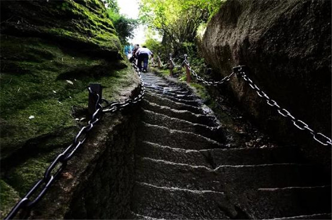 云梯高十余米,與地面垂直呈90度角,中上部外突,呈倒坎崖之勢(shì)。梯上置懸索三條,游人挽索而攀,身體無(wú)法貼近崖壁,因而隨索擺動(dòng),心旌神搖,如同云駕霧,故名云梯。云梯的開(kāi)辟,既縮短了自中峰登東峰的時(shí)間,又增加了游人履險(xiǎn)的興趣,開(kāi)通以來(lái),許多游客都愿在此攀登,一試身手。
