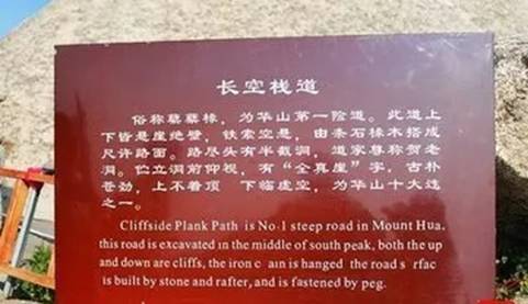 在約2160米高的峭壁上鑿出踏腳之處,鑲嵌石釘搭木椽并用鐵索固定建造的一條懸空棧道,那就是長空棧道。它位于華山極頂南峰東側(cè)南天門外的山腰間,經(jīng)燕子叼表、朝元洞,踩崖隙凌空懸梯下10余華山長空棧道米,沿附懸崖而搭寬不盈尺的方木棧道至全真巖下。
