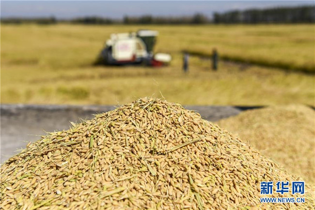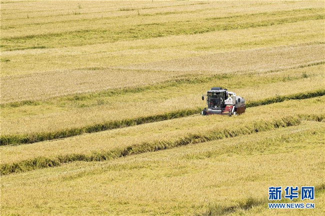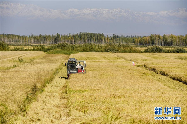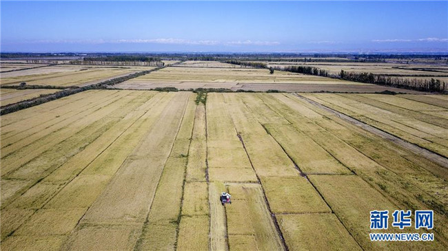 收割機在地處新疆察布查爾錫伯自治縣種羊場的“萬畝水稻優(yōu)質(zhì)高產(chǎn)高效示范區(qū)”收割水稻(9月26日無人機拍攝)。眼下,地處新疆伊犁河谷的察布查爾錫伯自治縣約20萬畝水稻迎來收割季。當(dāng)?shù)剞r(nóng)民搶抓農(nóng)時,忙碌在金色田園中。記者 胡虎虎 攝