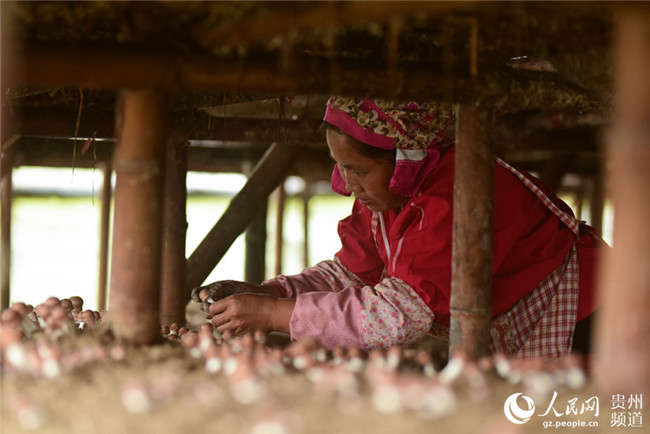 10月10日,村民在貴州省黔東南苗族侗族自治州丹寨縣排調(diào)鎮(zhèn)也改村姬松茸種植基地采摘姬松茸。楊武魁 攝