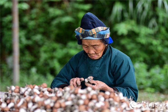 10月10日,村民在貴州省黔東南苗族侗族自治州丹寨縣排調(diào)鎮(zhèn)也改村姬松茸種植基地對剛采摘的姬松茸進行削根處理。楊武魁 攝