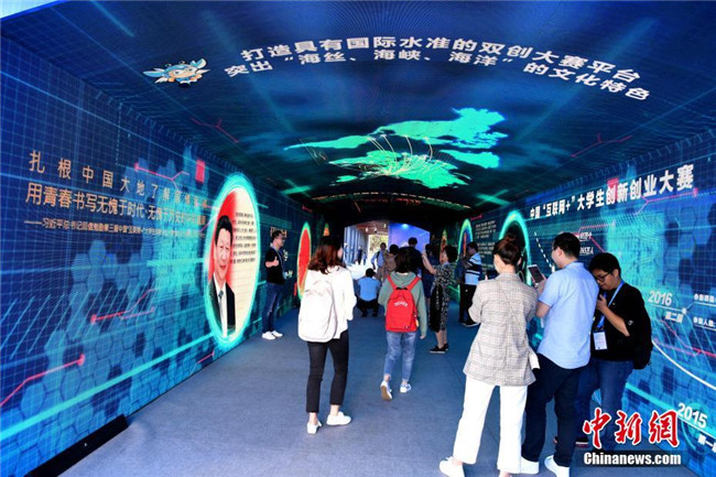 10月13日,第四屆中國“互聯(lián)網(wǎng)+”大學(xué)生創(chuàng)新創(chuàng)業(yè)大賽總決賽在廈門大學(xué)舉行。本屆大賽于今年3月份啟動(dòng),迄今累計(jì)已有近265萬大學(xué)生、63萬個(gè)團(tuán)隊(duì)參賽,涌現(xiàn)出一大批科技含量高、市場潛力大、社會(huì)效益好的高質(zhì)量項(xiàng)目,以“90后”為主的創(chuàng)新創(chuàng)業(yè)生力軍已全面發(fā)力,釋放出“青年+創(chuàng)新創(chuàng)業(yè)”的無窮力量。圖為創(chuàng)新隧道亮相廈大校園。中新社記者 王東明 攝