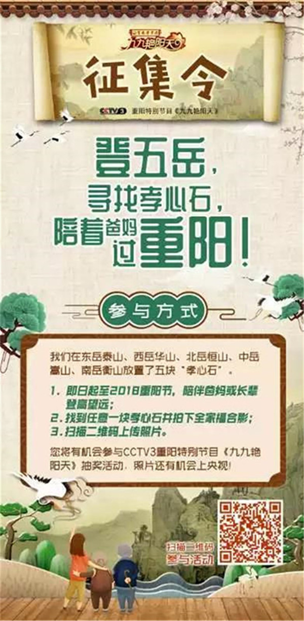 今天是2018年10月17日,農(nóng)歷九月初九重陽節(jié)。由中央廣播電視總臺央視綜藝頻道(CCTV-3)攜手中華五岳名山,共同舉辦的“登五岳 尋找孝心石 陪著爸媽過重陽”暨“福滿華夏 孝行五岳”最美笑容和祝福征集活動正在火熱進(jìn)行當(dāng)中,活動至10月17日重陽節(jié)。只要您陪著爸爸媽媽在五岳任意一塊“孝心石”旁拍下全家福合影,并通過掃碼填寫報名表格,上傳圖片,就可以參加CCTV-3重陽特別節(jié)目《九九艷陽天》的抽獎活動,照片還有機(jī)會上央視哦!