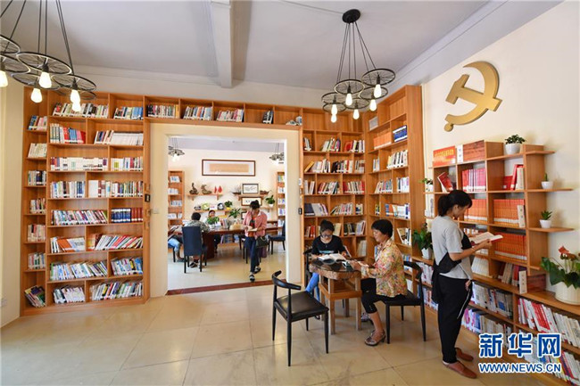 海南省萬(wàn)寧市山根鎮(zhèn)大石嶺村村民在村黨支部帶領(lǐng)村民共建的農(nóng)家書(shū)屋內(nèi)讀書(shū)(5月16日攝)。 新華社記者 李鑫 攝