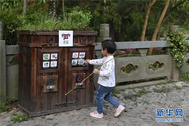 在浙江省衢州江山市石門(mén)鎮(zhèn)清漾村,小朋友將垃圾分類放入垃圾箱內(nèi)(4月20日攝)。新華社記者 黃宗治 攝