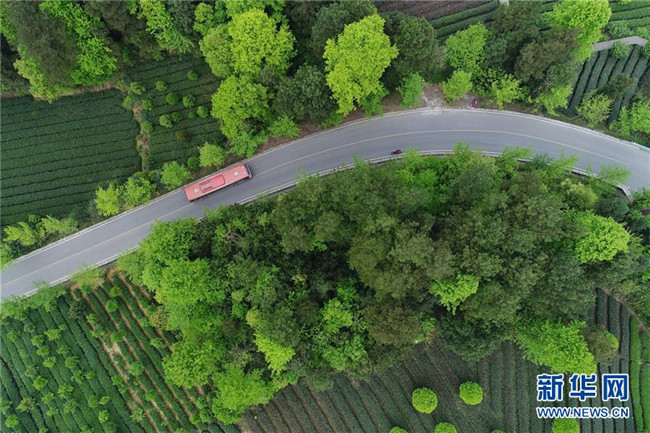 汽車(chē)在貴州省遵義市湄潭縣金花村內(nèi)的道路上行駛(4月12日無(wú)人機(jī)拍攝)。 新華社記者 歐東衢 攝