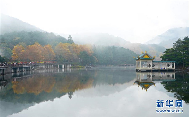 當(dāng)日,位于江西省九江市廬山風(fēng)景區(qū)內(nèi)的如琴湖云霧繚繞,層林盡染,吸引眾多游客前來觀賞游玩。