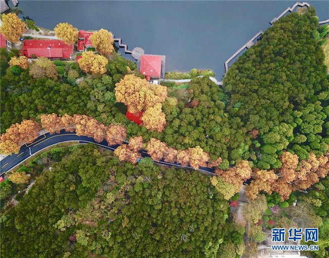 這是如琴湖旁公路的秋色風(fēng)光(10月20日無人機拍攝)?! ⌒氯A社記者 胡晨歡 攝