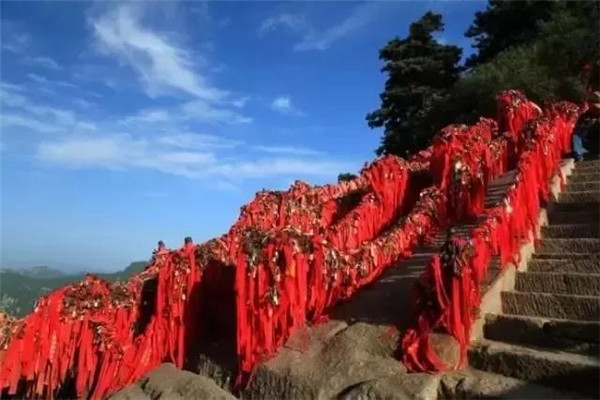 到達(dá)金鎖關(guān)時(shí),一番令人動(dòng)容的風(fēng)景——金鎖關(guān)關(guān)內(nèi)、關(guān)外登山路兩側(cè)的鐵索上,情侶鎖重重疊疊,紅繩彩線迎風(fēng)搖曳,筑成一道美麗的愛情心愿風(fēng)景線。 眼前大片大片的紅色,令游人的視覺和心靈受到強(qiáng)烈的沖擊。這是沿路兩邊鐵鏈上綁滿的密密麻麻的紅色絲繩,不留一絲空隙,風(fēng)吹來,長(zhǎng)長(zhǎng)的紅色絲繩就輕盈的舞起來,如愛情牢固的臂膀,甜蜜的飛翔在華山之上。