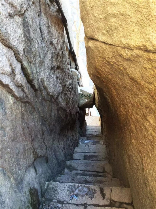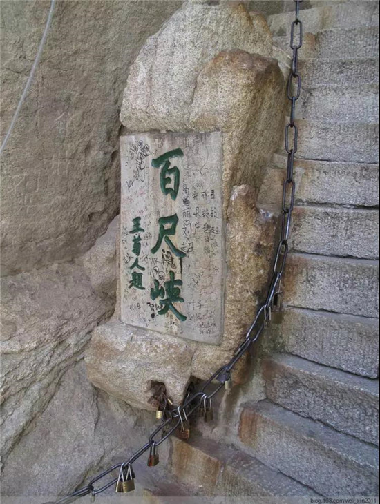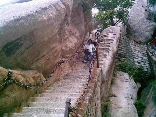 “千尺幢”在華山峪古道“回心石”上,是經(jīng)華山峪登主峰的必經(jīng)之道。這里原為一崖間裂隙,直立70度,后來人們沿隙鑿?fù)爻陕罚惺A370級,階寬僅容半足,游人登臨時,仰視一線天,俯視若臨深井。