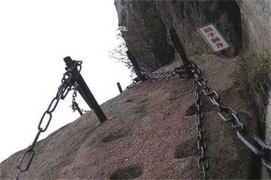 在南天門外,是華山著名險道之首“長空棧道”。棧道路分三段,出南天門石坊至朝元洞西,路依崖鑿出,長20米,寬二尺許,是上段;折向下行,在崖隙間橫貫有鐵棍,形如凌空懸梯,游人須挽索逐級而下,稱之“雞下架”,是中段;西折為下段,筑路者在峭壁上鑿出石孔,楔進(jìn)石樁,石樁之間架木椽三根,游人至此,面壁貼腹,腳踏木椽橫向移動前行。這里只是探險之道,并非登山必由之路,膽小的游客觀望一下即可,體力和膽量沒有把握則不要輕易冒險。所以石刻上不少警告之語,如“懸崖勒馬”等。