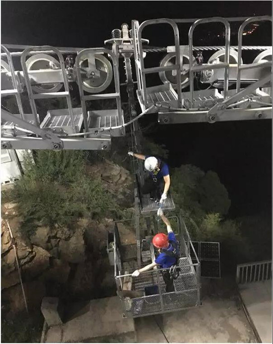 每年的五一和十一是景區(qū)游客最多的時(shí)候,也是索道維護(hù)工最忙的時(shí)候。除了正常巡線外,維護(hù)工還要分出一部分人到每個(gè)支架下面固定值守。有一年送完游客后剛準(zhǔn)備撤離時(shí),山上突然刮起了大風(fēng),索道保護(hù)性停車,值守在支架下的維護(hù)工們就在野外呆了一夜。山上夜晚的風(fēng)特別大,感覺能把人連帳篷吹到溝里去。那一夜,巨文躲進(jìn)套在支架爬梯外邊的鐵皮護(hù)筒里,蜷縮著熬過了一個(gè)漫長的夜晚。