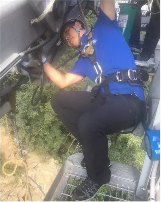 索道維護(hù)工每隔2小時(shí)坐檢修車沿索道線巡查一次。檢修車四面敞開、像個(gè)吊籃一樣。坐在全封閉的索艙里,尚有游客嚇得大喊大叫,站在四面敞開的檢修車上的感覺可想而知。