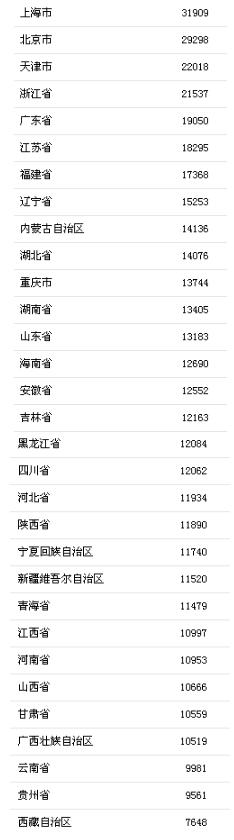 前三季度31省區(qū)市人均可支配收入。來自國家統(tǒng)計局