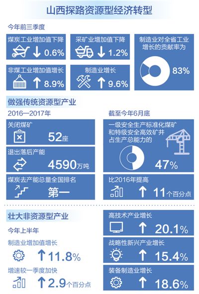 今年前三季度,山西的煤炭工業(yè)增加值下降0.6%,非煤工業(yè)增加值增長8.9%;采礦業(yè)增加值下降1.2%,制造業(yè)增長9.6%。制造業(yè)對(duì)全省工業(yè)增長的貢獻(xiàn)率為83%,引領(lǐng)了山西工業(yè)的增長。同時(shí),非煤產(chǎn)業(yè)稅收完成735.9億元,同比增長24.2%,占稅收收入比重為54%,成為今年稅收快速增長的重要支撐。