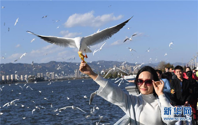 11月19日,游客在昆明滇池海埂大壩給紅嘴鷗喂食。 新華社記者楊宗友攝