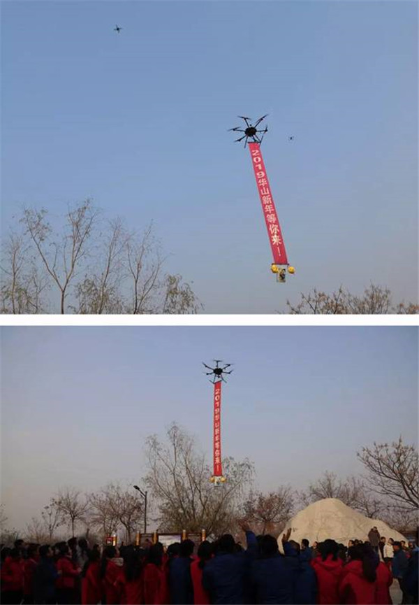 啟動儀式上,華山景區(qū)還為活動前期征集的十名幸運游客送上新年大禮包,讓跨年登山的游客享受到華山的新年祝福。同時,為了配合活動效果,讓華山新年更具新意,現(xiàn)場出動三架無人機進行空中表演,更是以語音播報及橫幅展示的方式為現(xiàn)場游客送上新年寄語。