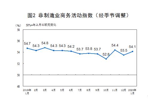 2020年1月份,非制造業(yè)商務活動指數(shù)為54.1%,比上月上升0.6個百分點,表明非制造業(yè)總體保持擴張。