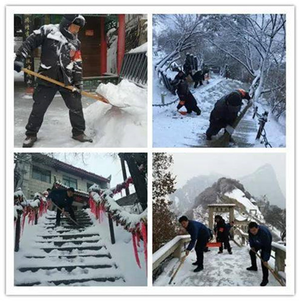 2月9日晚,一場大雪突降華山景區(qū),當(dāng)工作人員與游客一起沉浸在新年的喜悅氛圍時,華山景區(qū)悄然鋪上了一層厚厚的積雪。2月10日早6時,華旅集團(tuán)通過多渠道號召全體員工在各自崗位迅速開展掃雪除冰工作。雪情就是命令,來不及欣賞新年首場雪景,廣大員工扛起掃把鐵鍬等掃雪工具,第一時間奔赴“戰(zhàn)場”,全力確保景區(qū)恢復(fù)運(yùn)營。