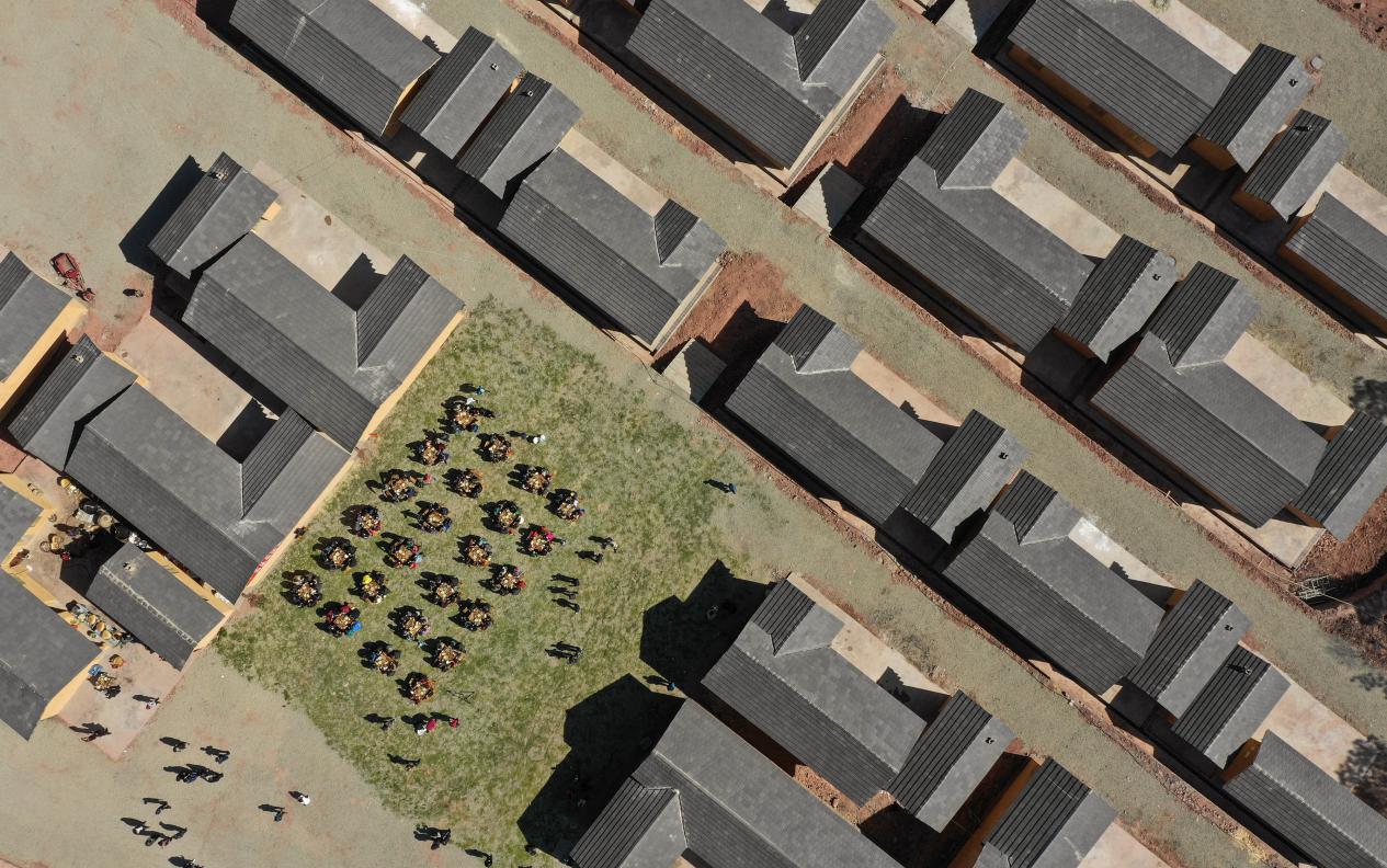 2019年2月11日,在昭覺縣三河村的易地扶貧安置點(diǎn),彝族群眾圍坐在一起吃起壩壩宴,熱熱鬧鬧地慶祝喬遷之喜。來源:新華網(wǎng)