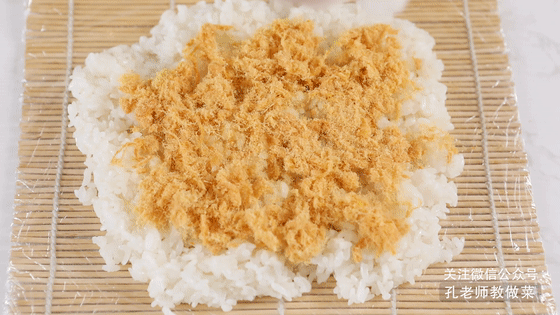 4.竹簾上鋪一層保鮮膜,將蒸好的米飯趁熱盛出鋪在竹簾上,竹簾邊緣留出2cm左右的空隙。(米飯趁熱時(shí)操作才不會(huì)粘手,如果有點(diǎn)粘手的話,可以將雙手粘少許涼白開(kāi)水操作。)