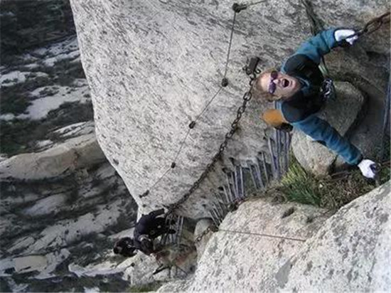 華山道路最危險的地方當屬“長空棧道”,13英尺長,1英尺寬的木板就修在垂直的懸崖之上。在那里的一個失足就會使你墜入下面的萬丈深淵。棧道上有安全帶加以保護,如果你想冒險嘗試,綁上安全帶并把你系在繩索上,在一些地段,僅有一條安全帶和一些鑿在石頭里的腳窩作為支撐。