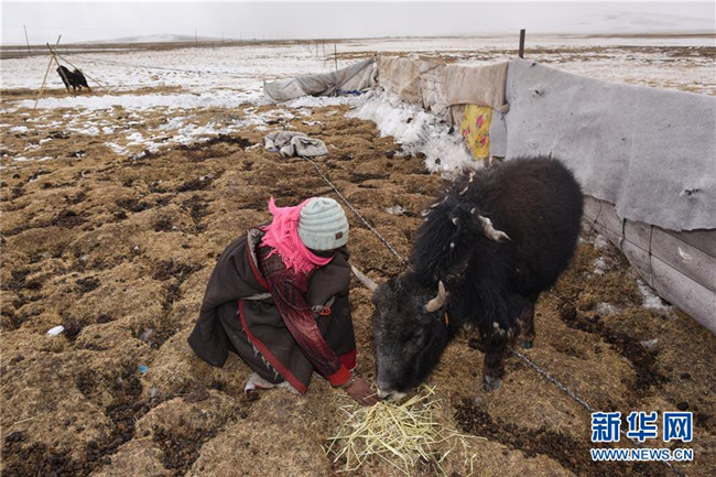 2月22日,一名轉(zhuǎn)場過來的藏族婦女在麥雄灘上給牛喂飼草料。新華社記者吳剛攝