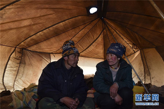 2月22日,查周和妻子在麥雄灘的帳篷內(nèi)聊天。新華社記者吳剛攝